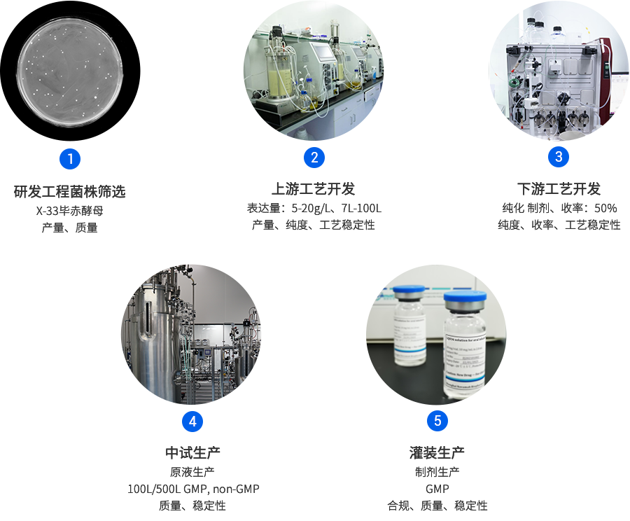 凯发K8天生赢家一触即发生物已成功建立毕赤酵母CMC平台,现在已具备多个完整项目开发经验。毕赤酵母CMC平台90%以上的项目产量在1g/L以上,纯化平台工艺,其整体回收率在50%以上。从细胞株构建到蛋白纯化仅需3-4个月,极大地缩短了项目开发时间。